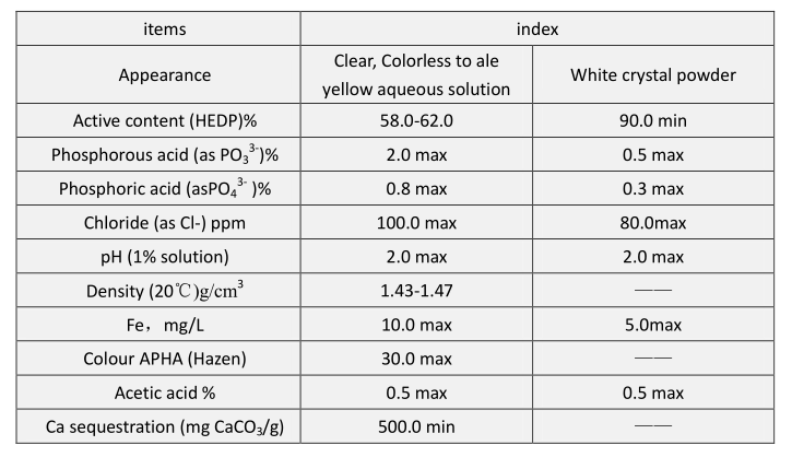 HEDP is an organophosphoric acid corrosion inhibitor. It can chelate with Fe, Cu, and Zn ions to form stable chelating compounds. It can dissolve the oxidized materials on these metals’ surfaces. HEDP shows excellent scale and corrosion inhibition effects under temperature 250℃. HEDP has good chemical stability under high pH value, hard to be hydrolyzed, and hard to be decomposed under ordinary light and heat conditions. Its acid/alkali and chlorine oxidation tolerance are better than that of other organophosphoric acids (salt). HEDP can react with metal ions in water system to form hexa-element chelating complex, with calcium ion in particular. Therefore, HEDP has good antiscale and visible threshold effects. When built together with other water treatment chemicals, it shows good synergistic effects.